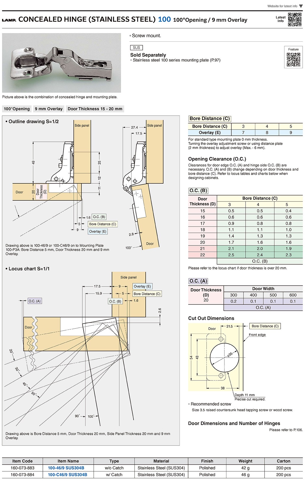 100-46/9 SUS304B Петля накладная без пружины из нержавеющей стали 100º/9 мм