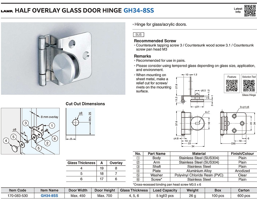 GH34-8SS Петля полунакладная для стеклянной двери, нержавейка