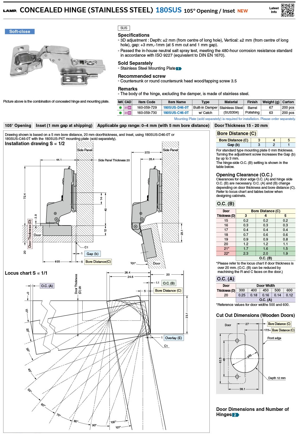 180SUS-D46-0T Петля внутренняя с плавным закрыванием из нержавеющей стали 105º
