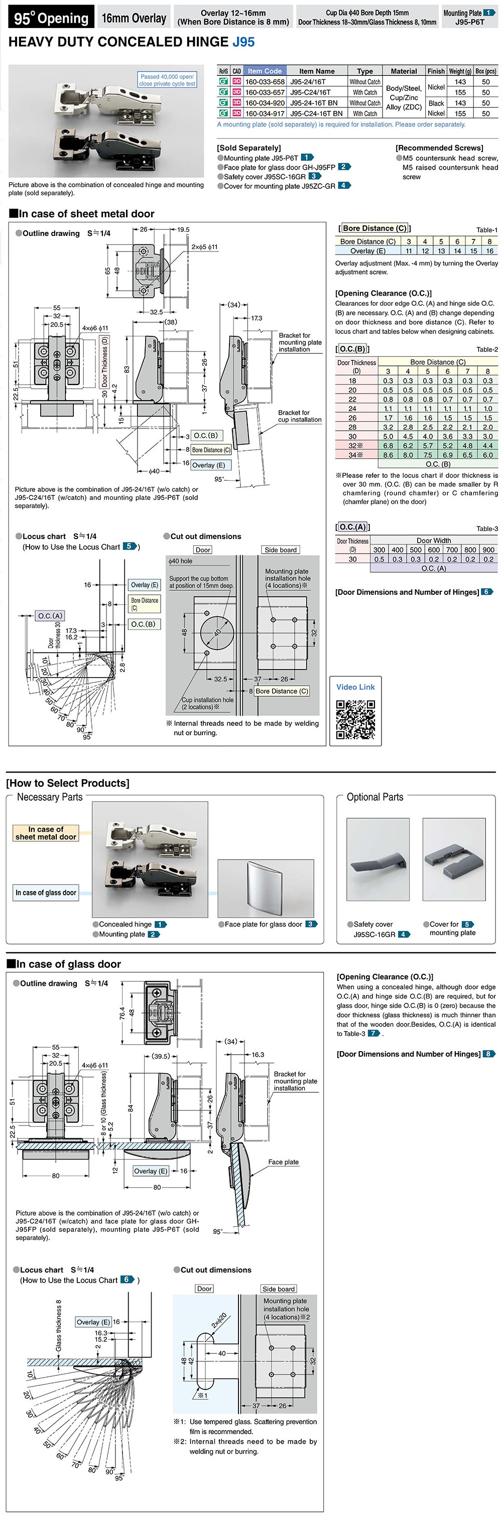 J95-C24/16T Петля полунакладная для тяжёлых фасадов, с пружиной, никель