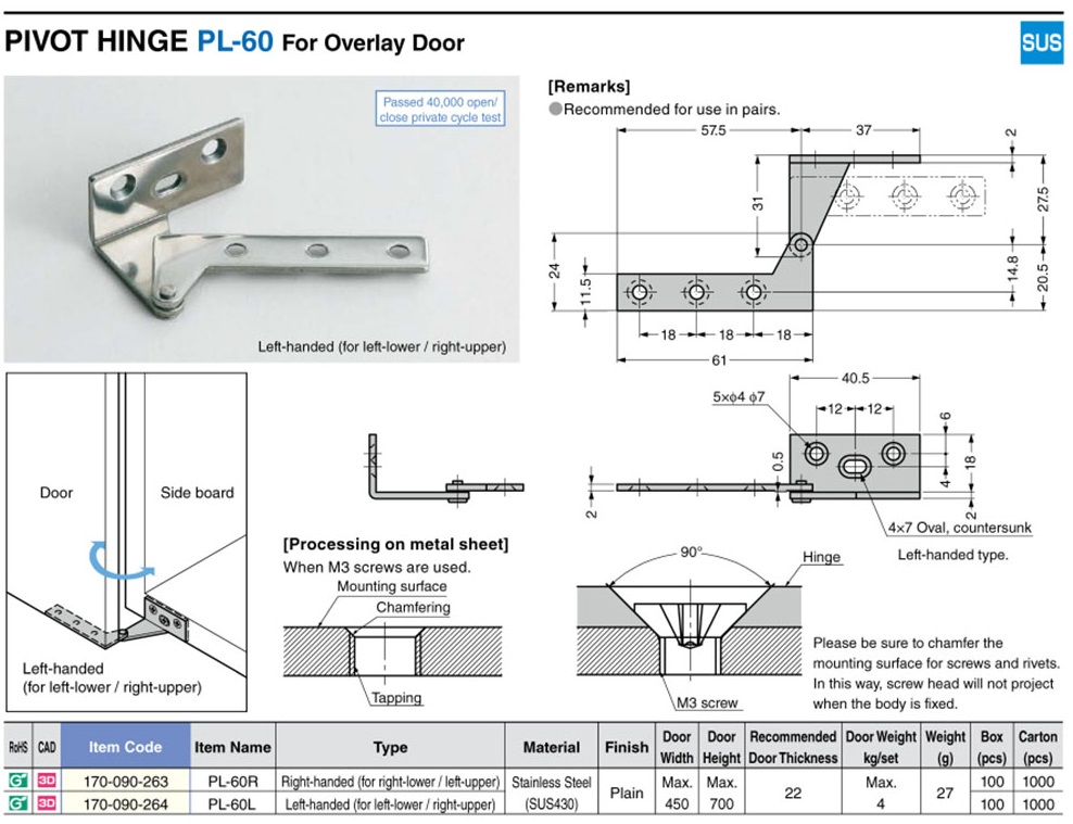PL-60R Петля накладная поворотная из нержавеющей стали, правая