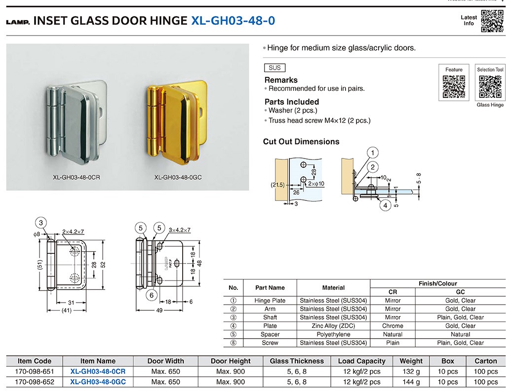 XL-GH03-48-0CR Петля внутренняя для стеклянной двери 5-8 мм, хром
