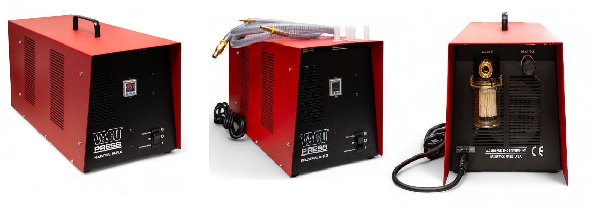 Созданный по образцу оригинального вакуумного насоса Professional VacuPress® производительностью 10 м3/час, промышленный вакуумный насос Hi-Flo VacuPress® обеспечивает надежную работу и повышенную скорость, необходимую крупным деревообрабатывающим мастерским. За основу помпы был взят необслуживаемый сухой ротационный вакуумный насос мощностью 550 Вт производительностью 16 м3/час. Увеличенная мощность в сочетании с более широкими линиями откачки воздуха и Y- образным шлангом для подключения к вакуумному мешку обеспечивает достижение полного вакуума на 100% быстрее профессиональной модели. Повышенная производительность помпы чрезвычайно важны при работе с крупными изогнутыми деревянными деталями и при работе с несколькими мешками (промышленный вакуумный насос Hi-Flo VacuPress® может обслуживать до трех мешков со шпоном при использовании переходника-коллектора).
